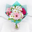 (на фото) гербера розовая - 3 шт, хризантема кустовая ромашковая - 3 шт, роза кустовая розовая - 1 шт, рускус, упаковка, лента. Примерный диаметр букета 30х30 см.