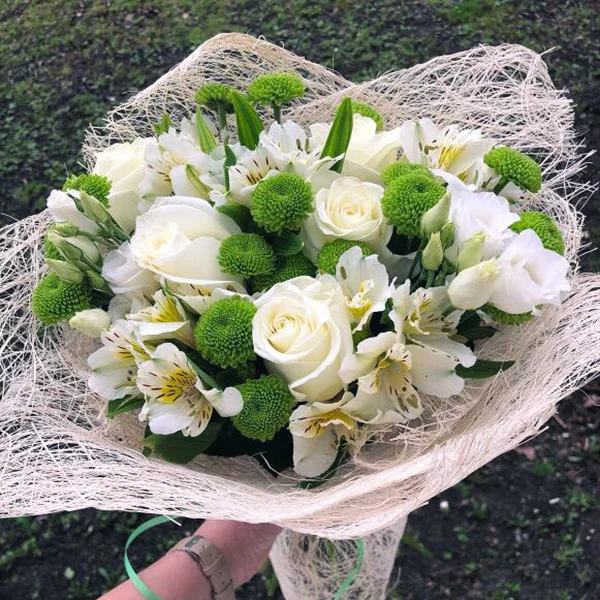 ДЕЛЮКС: роза белая - 15 шт., эустома белая - 10 шт., альстромерия белая - 11 шт., хризантема кустовая зеленая - 11 шт., фетр зеленый.