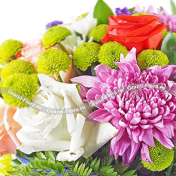 ЛЮКС: роза розовая - 2 шт., роза белая - 2 шт., роза красная - 5 шт., хризантема одноголовая белая - 2 шт., хризантема одноголовая зеленая (шамрок) - 2 шт., хризантема одноголовая фиолетовая - 2 шт., хризантема кустовая зеленая (сантини) - 2 шт., хризантема кустовая розовая - 2 шт., статица - 1 шт., декоративная зелень, фетр фиолетовый, + коробка конфет в подарок.