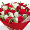 Люкс: роза красная - 7 шт., тюльпан белый - 8 шт., фетр красно - белый, бант красный.