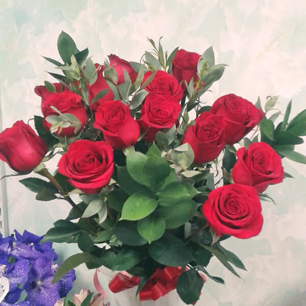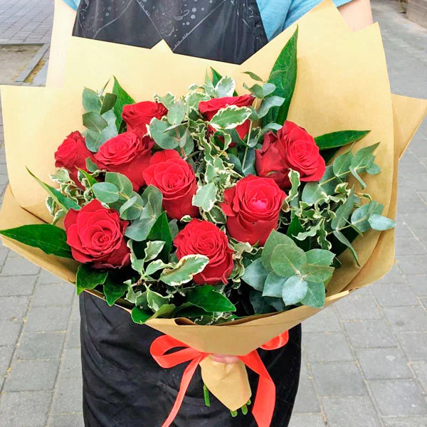 Букет из красных роз, гармонично дополненный рускусом и эвкалиптом, станет отличным поздравлением как для женщин, так и для мужчин.