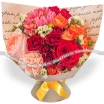 Уменьшенный: роза красная - 1 шт., роза кустовая красная - 2 шт., роза кустовая оранжевая - 1 шт., гвоздика персиковая - 1 шт., роза персиковая - 1 шт., хризантема кустовая розовая - 1 шт., статица белая, упаковка, лента.