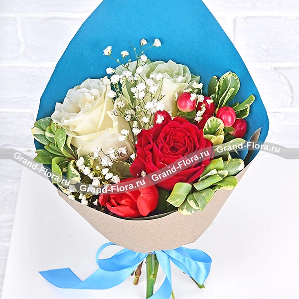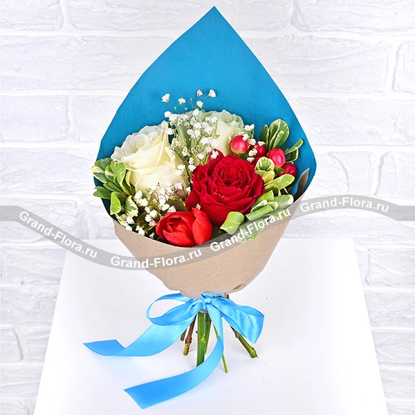 Стандартный: роза красная - 1 шт., роза белая - 2 шт., тюльпан красный - 2 шт., гиперикум, зелень, упаковка, лента. Примерный размер: 20Х25 см.