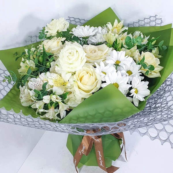 ДЕЛЮКС: роза белая - 15 шт., эустома белая - 10 шт., альстромерия белая - 11 шт., хризантема кустовая белая - 11 шт., фетр зеленый.