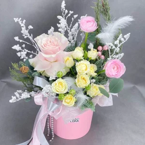 Этот букет — настоящее произведение флористического искусства, созданное, чтобы выразить самые нежные и глубокие чувства. В его центре — розовые кустовые розы, которые на языке цветов означают глубокую привязанность и благодарность.
